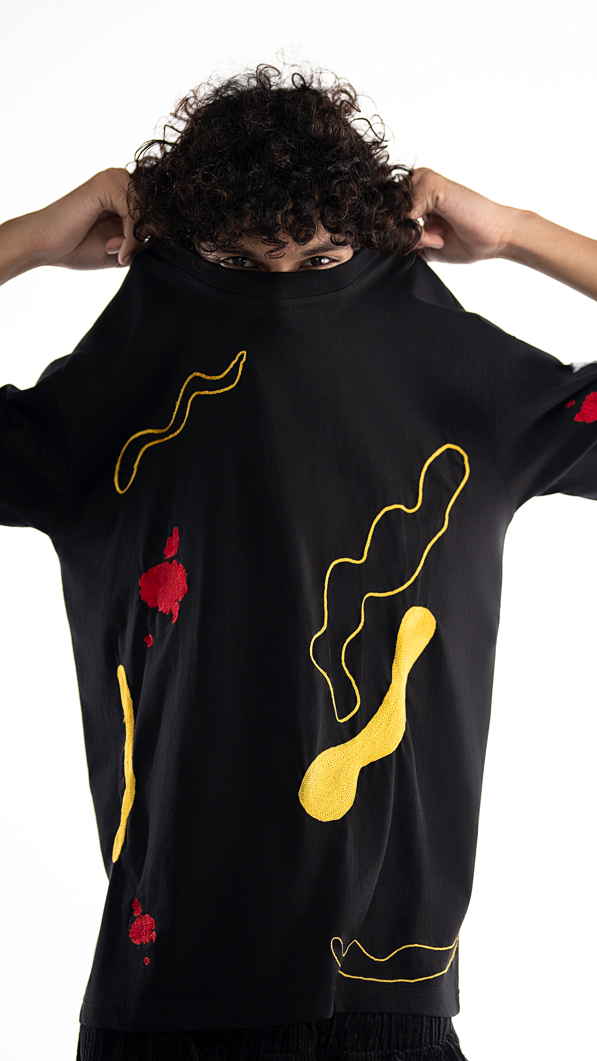 Inspired by the Deccan Trap a geological feature within the Deccan Plateau, often linked to the mass extinction of dinosaurs, this tee encapsulates that history. The yellow hand-embroidered design represents the arid landscape of the plateau, while the red map signifies its geographic layout—an ode to the region's significance in the extinction narrative. In addition to its design, the tee features a small printed patchwork on the sleeve, serving as a visual narrative of the Deccan Trap. This detail further defines and encapsulates the essence of this geological phenomenon, offering a subtle yet powerful tribute to its historical significance.