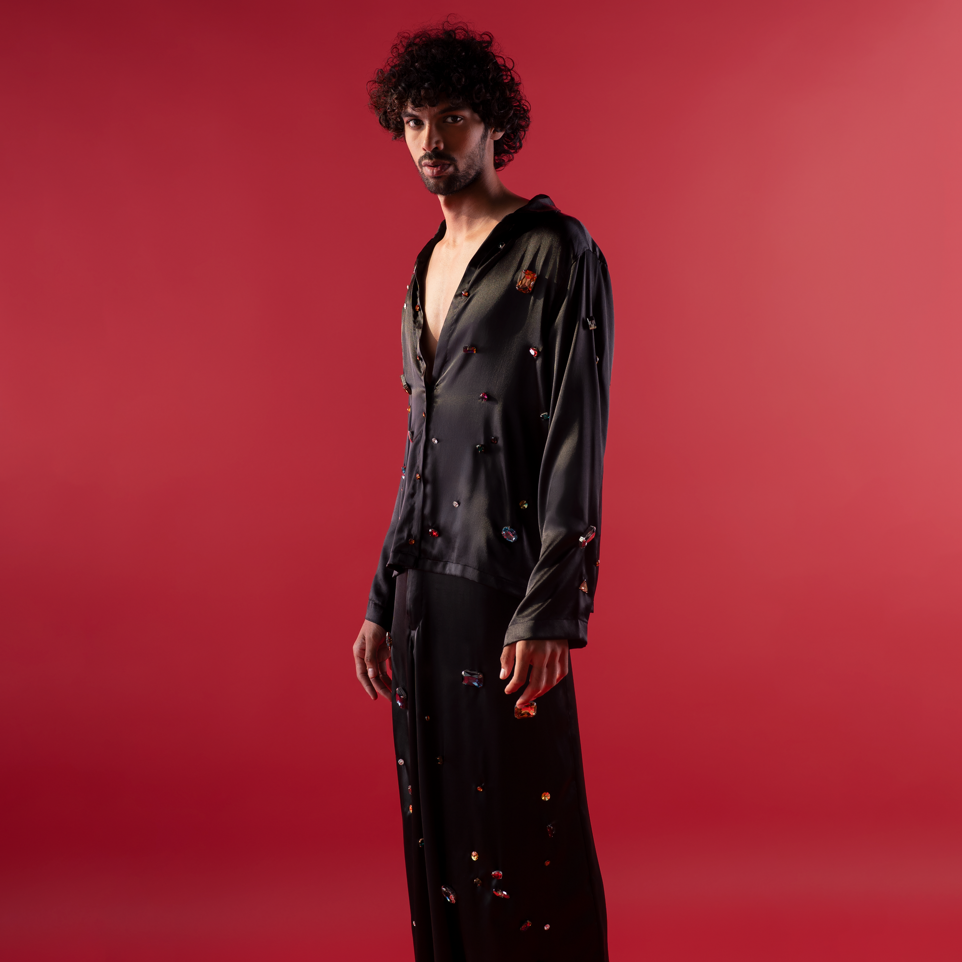 Pure satin silk swarovski shirt adorned with Swarovski stones.