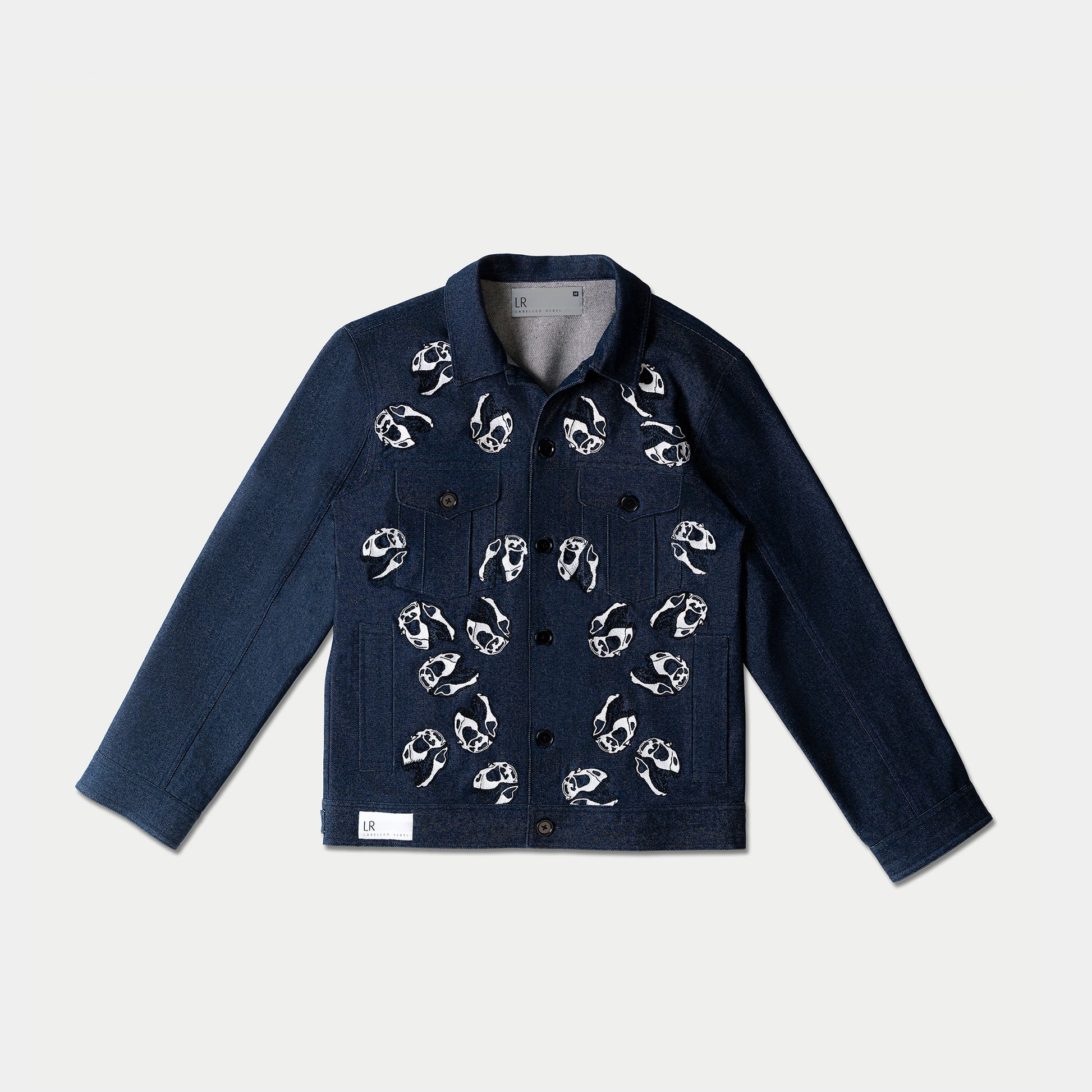 A classic blue denim jacket elevated with hand-embroidered white dinosaurs scattered. Finished with sleek black buttons.